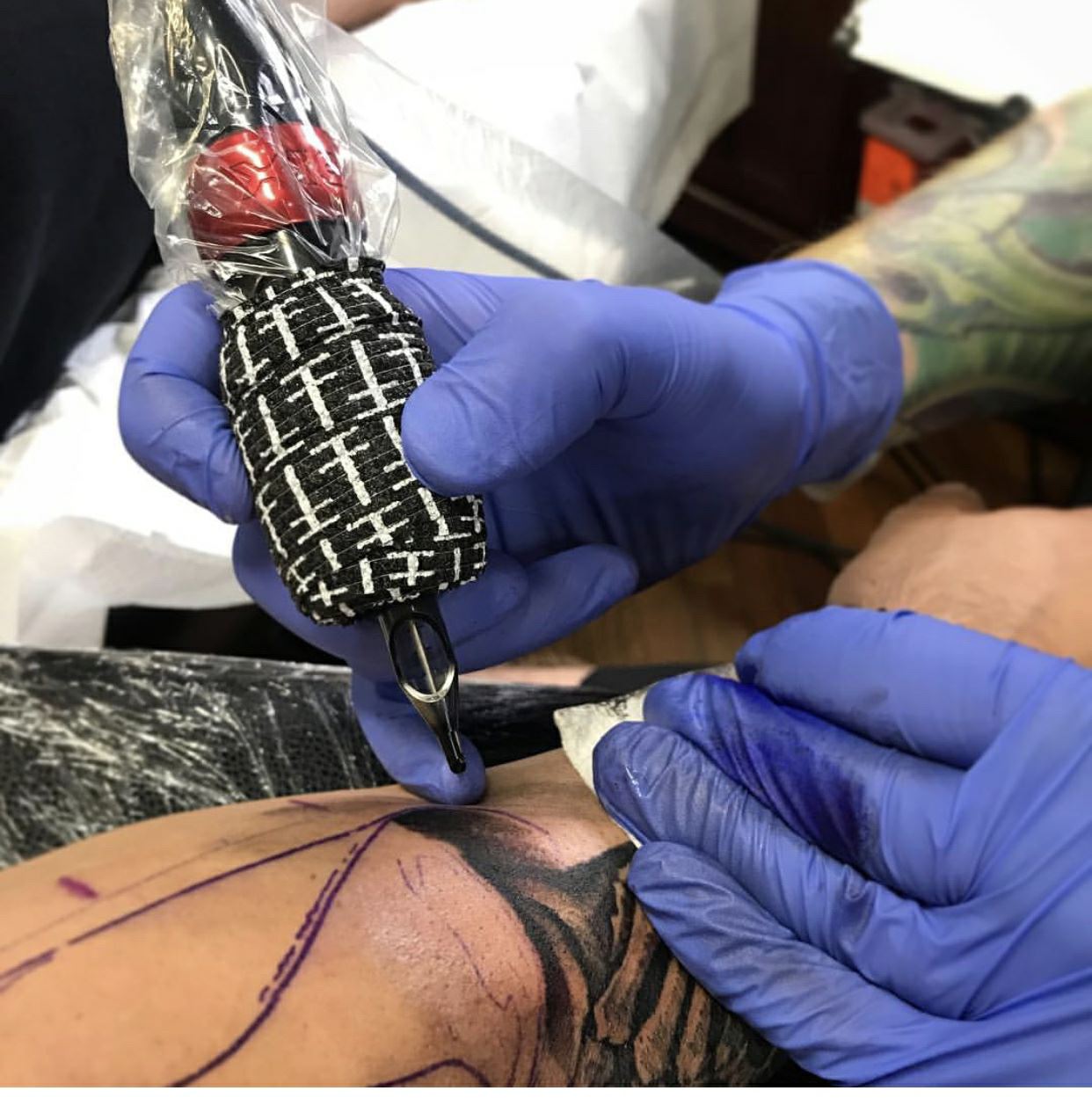 Клей-бандаж для татуювання-це еластична пов’язка з обгортанням з 90% нешкільної тканини та 10% спандексу, це клейова пов'язка. Його часто використовують для обгортання ручки татуювальної машини, що допомагає запобігти ковзанню ручки під час використання та збільшує тертя пальців, що може допомогти вам більш точно намалювати конструкції татуювання.
