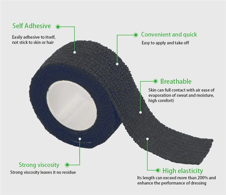 Чорна липка пов'язка виготовлена з високоякісної еластичної тканини, покрита шаром природних частинок полімеру з обох боків еластичної тканини та обробляється певним процесом. Чорний продукт клею не дотримується волосся, шкіри, одягу і не падає у випадку пота. Самостійка еластичних пов’язок повинна мати рівномірний блиск, чисті надрізи, без запаху, плям та оголених задирок; Сила розриву не повинна бути менше 10n/см; Самостійкість не повинна бути менше 3N/см; Подовження не повинно бути менше 50%; Немає роздратування шкіри. Продукт виготовлений з чистої бавовняної тканини, покритої медичним тиском, клейким або натуральним латексом, нешкільною тканиною, пластиром Kinesio, еластичною тканиною, медичною марлею, еластичною нешкільною тканиною та натуральними гумовими композитними матеріалами. Це також ідеальний продукт для перевезення пацієнтів у ортопедії, загальній хірургії, ортопедії та судинних захворюваннях.