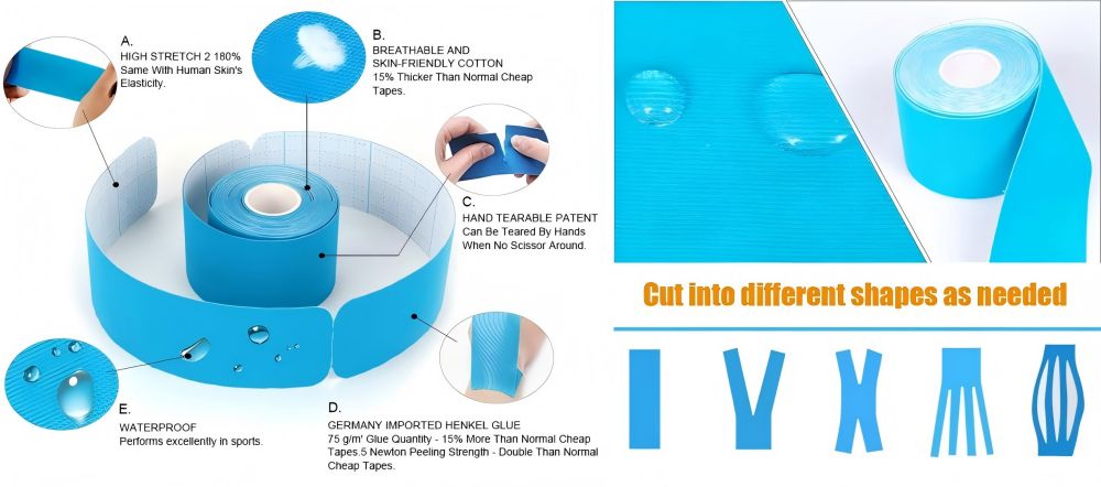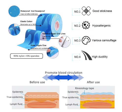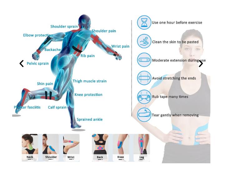 1. Само кінезіологічна стрічка є водонепроникною, еластичною, дихаючою та зручною для шкіри. Це може зняти проблеми з набряками та допомогти лімфатичному кровообігу; Він підходить для всіх частин тіла, що застосовується до спорту, фізичної терапії, схуднення та інших сценаріїв