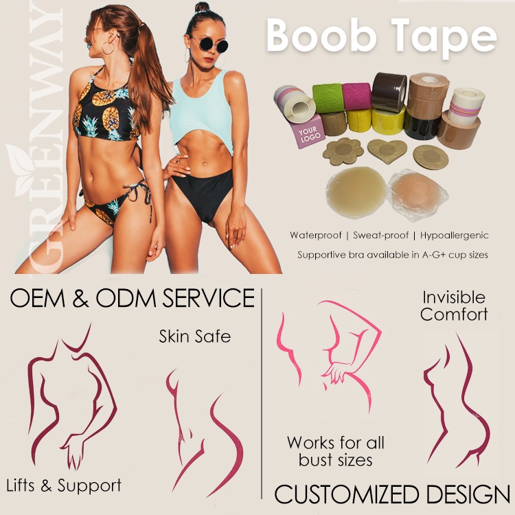 Стрічка Boob виготовлена з 95% бавовни та 5% суміші спандексу, м'якої та зручної для шкіри, вона має сильну еластичність та хорошу проникність повітря. Бюстгальва стрічка виготовлена з імпортного гіпоалергенного клею, а конструкція поверхні клею водної хвилі робить стрічку для сиськи більш дихаючою, тому вам не доведеться надто турбуватися про алергічні симптоми, спричинені тривалим використанням.